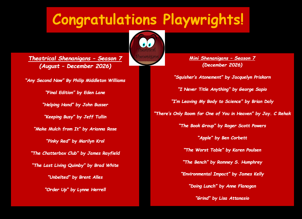 MAKE MULCH FROM IT was selected from over 78 submissions to be a part of Theatrical Shenanigans’ seventh season of podcasts out of the U.K. Streaming August - December 2026.
